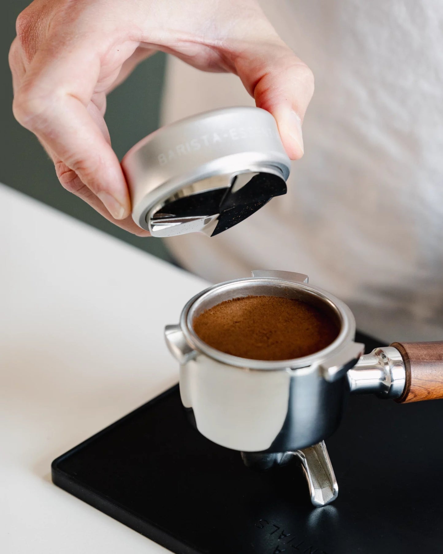 Efter fordeling er korrekt tamping afgørende. Også her gør det rigtige værktøj en forskel. Se vores tampers eller 2-i-1 tamper & kaffefordeler.