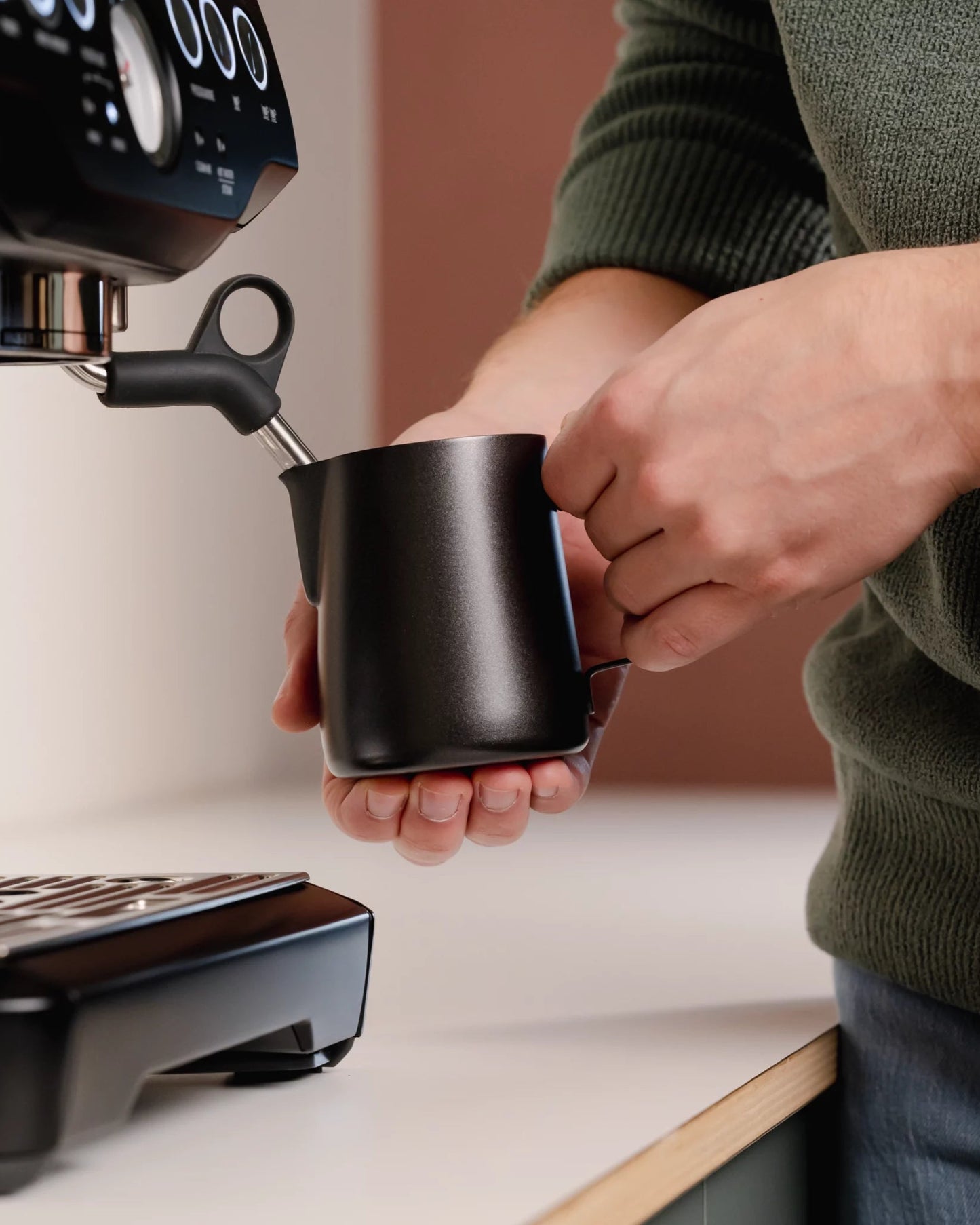 Evergreen Espresso – Opkaldt efter vores Pine Green kop. De dybe, jordagtige toner passer perfekt til vores Sulawesi kaffe. Denne blend tørres på traditionel vis, hvilket giver en næsten mørkeblå/grøn bønne. En sort Essentials-kande (350 ml) fuldender dette sæt.