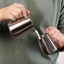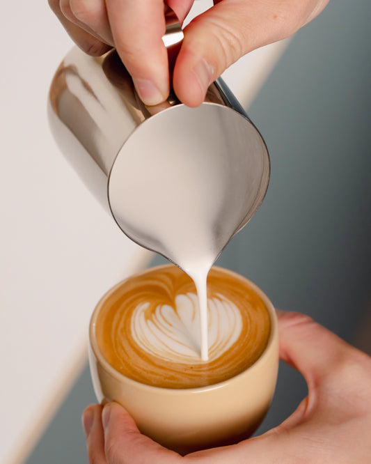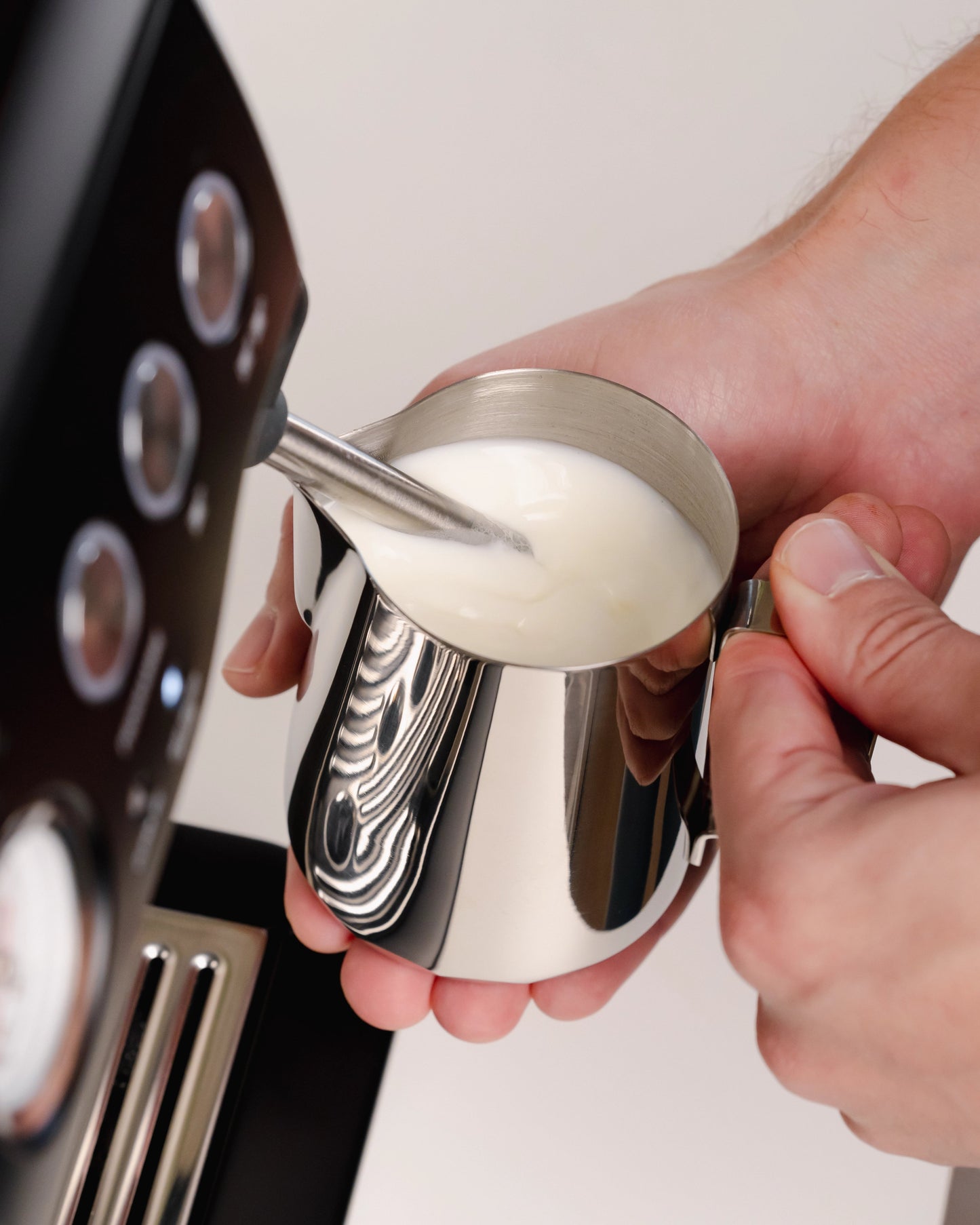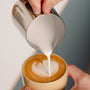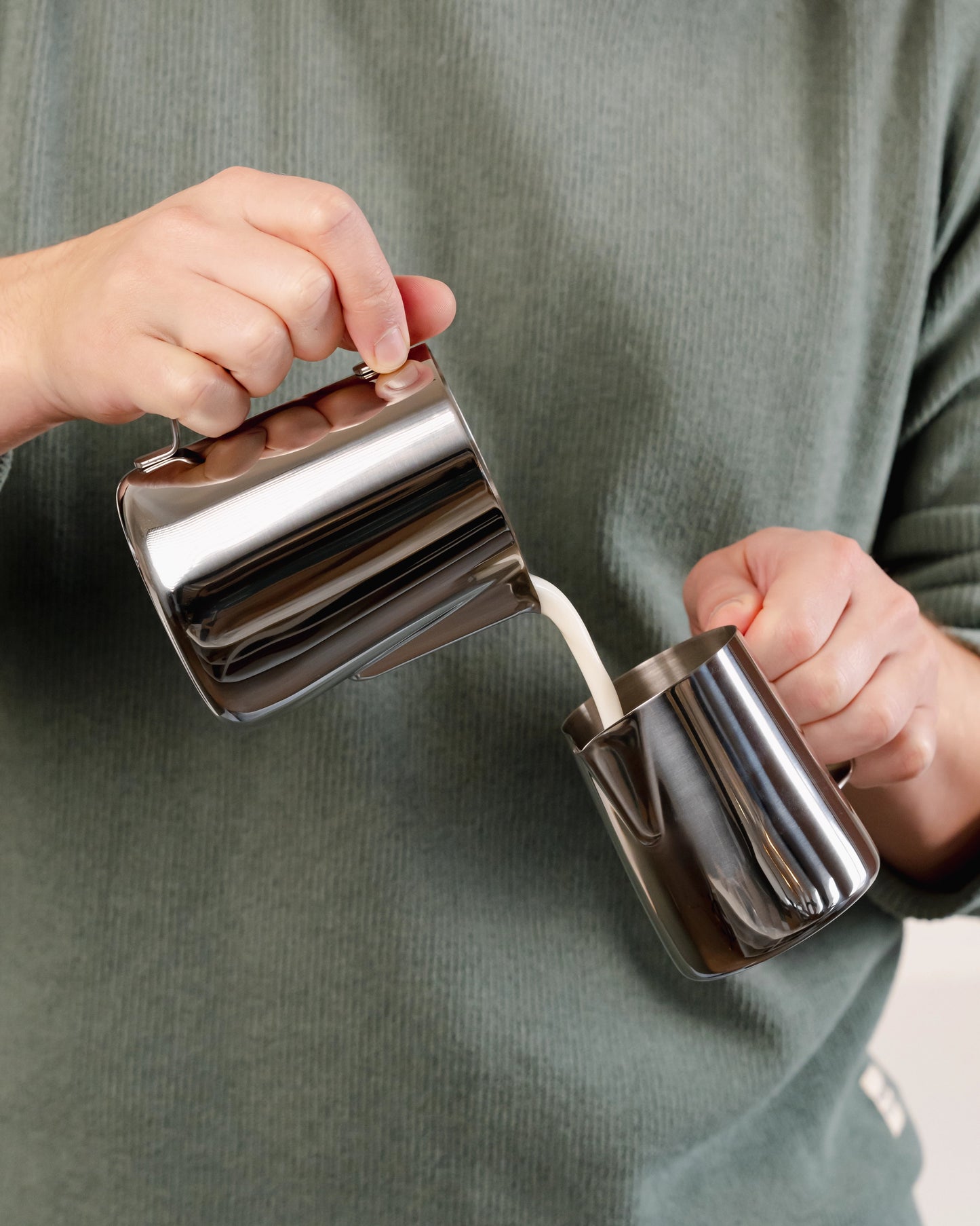 Pouring the milk between two pitchers breaks down bubbles and blends the foam for that silky-smooth texture. It's a small step that makes a huge difference, especially when you want your designs to look clean and professional.