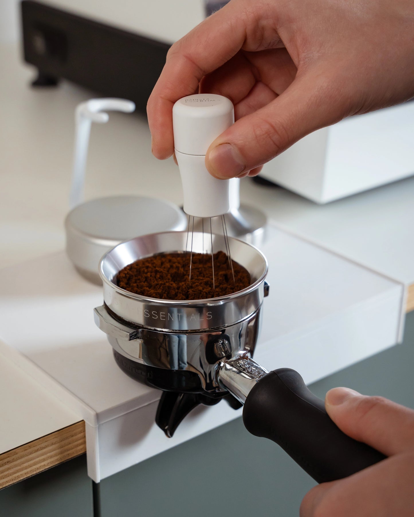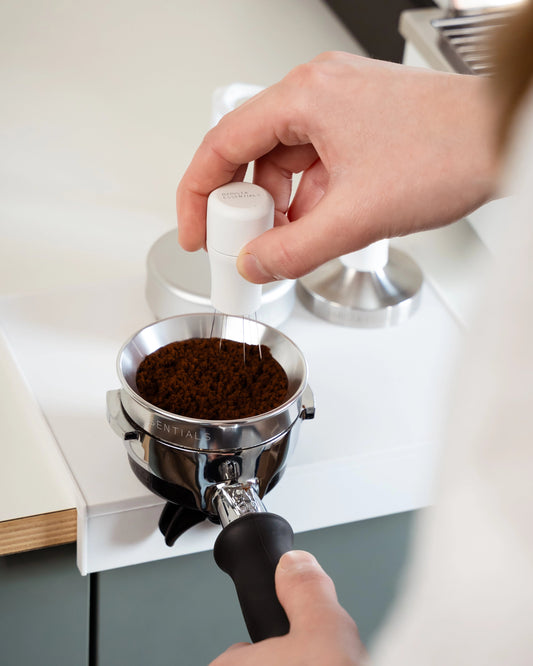 After grinding, you stir through the coffee with this tool (use a dosing ring to prevent spilling). This breaks up clumps and distributes the coffee perfectly before tamping. I was genuinely surprised by the impact this had on my espresso.